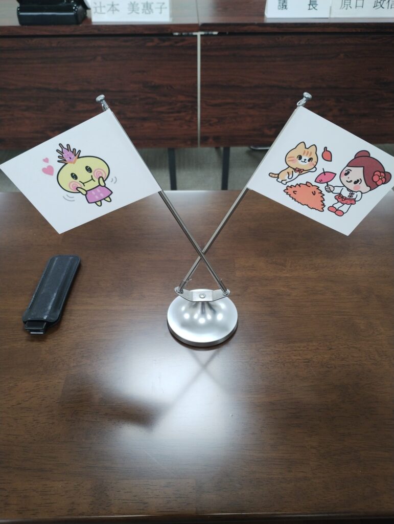11月20日 昨夜、会津若松市の視察から帰りました。そして、今日お昼に全員協議会を終え、帰ろうとすると、香川県内善通寺市からの視察の準備がされていました。お互いに、視察にお邪魔したりお迎えしたりです。机に、双方の市のキャラクターの旗が飾られ...