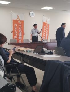 facebook9月26日 今日で9月議会の全ての日程が終わりました。この写真は、午後からの議員全員協議会開会前、こども家庭課の課長たちが幟旗を持って、こども虐待防止オレンジリボン運動をアピールしようと開会を待っているところです。内容は深刻ですが、先程までの緊張した雰囲気とは打って変わって、場がなごむ景色に、思わず「写真を撮っていいですか?」と聞いてしまいました。