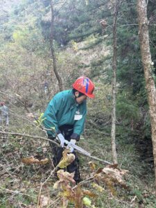 11月22日 年に2回の森林ボランティア facebook 2025.12.1411月22日 年に2回の森林ボランティアの日でした。野鳥の森に着くと空気がきれいなことに気が付きました。来た甲斐があります。ツルに絡め取られ、覆い尽くされて育っていないクヌギの苗からツルを取り払ってあげるのに時間がかかりました。既に食い込んでいましたがツルの根も抜いたので、せめて来年は精一杯伸びて欲しいと思いました。来年度は椎茸の植菌を計画しているそうで楽しみです。もっと多くの人に水源を守る森のよさを知っでらえますように!
